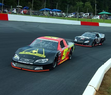 Kitzmiller found himself up front after 14 laps had been ticked off the board, but nearly lost it all as the field came up to lap the # 20 of newcomer Steve Bush. Bush, a multi-time Vintage race winner, unfortunately couldn’t get out of the way quick enough as the # 21 of Jeremy Mayfield, Wilcox, and the # 57 of Donnie Doster all get involved in a multi-car wreck entering into three. Right as the caution fell, the sky opened up and drenched the entire track within minutes. But with the diligence of the track crew, we were back racing in no time. Despite his damage, Mayfield took the lead soon after, leaving Kitzmiller to search all around the track for a way by. The fans were treated to a fantastic battle as after a little door banging coming off of four, Kitzmiller regained the top spot. Once the checkered flag flew, it was Kitzmiller ahead of Mayfield, the # 79 of AJ Henriksen, Shotime Mike, Wilcox, and Bob Schacht in the # 75. Taking the first Howe Racing Enterprises Hard Charger Award is Henriksen, making up three valuable spots on the track.